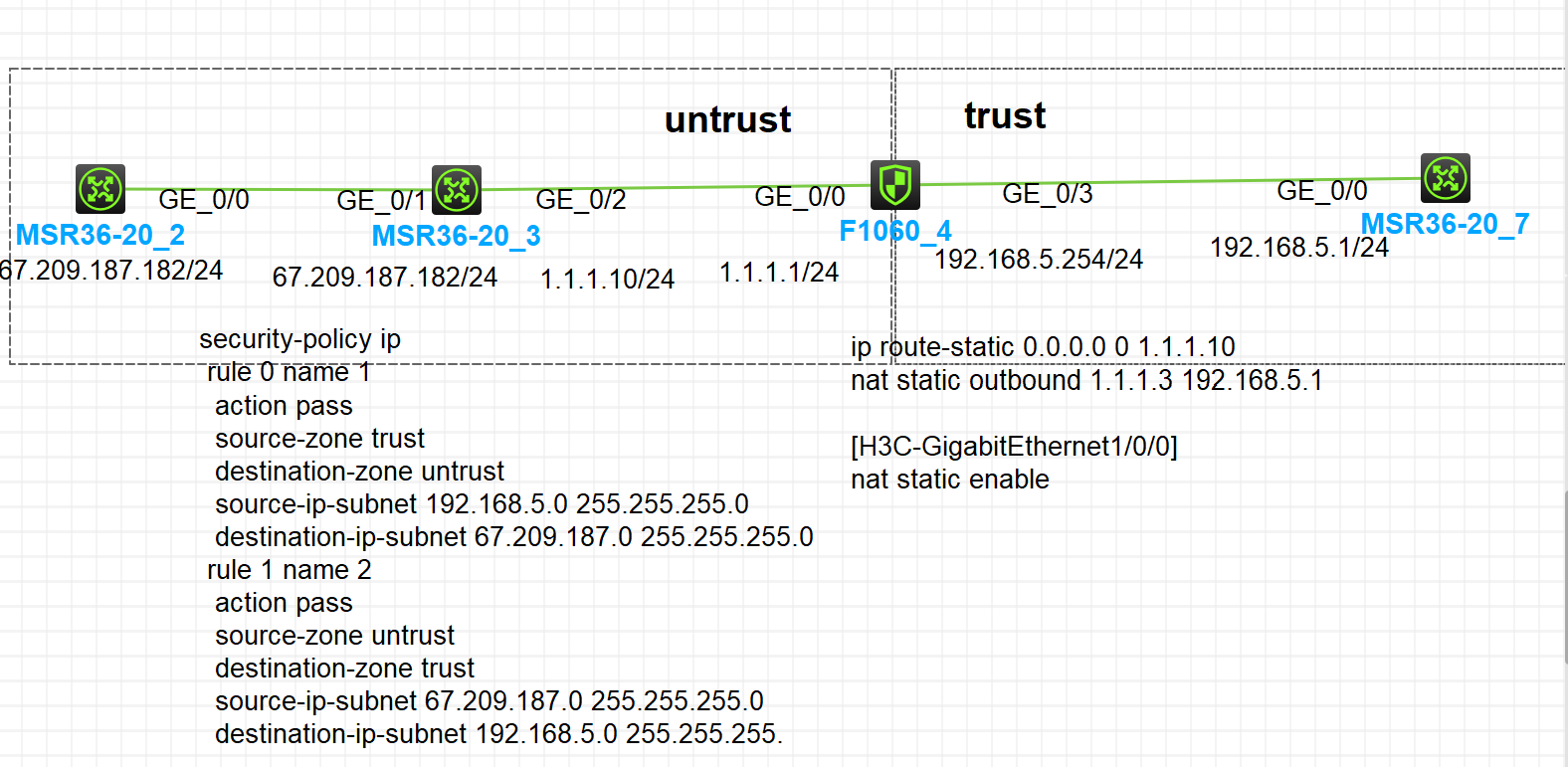 在F1060_4上做了静态NAT,但是发现MSR-20_7和发现MSR-20_2不能通过1.1.1.3互访