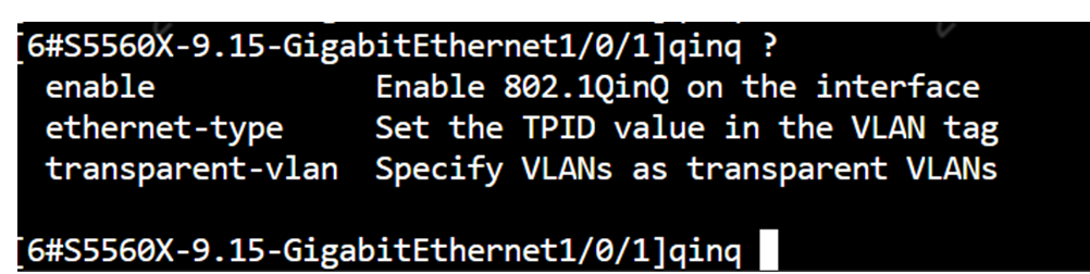 看操作界面是5560X的设备,5560X的配置手册就是没看到qinq vid的命令;前方具体是什么型号设备、什么软件版本,参考对应的手册查下是否有相关命令;