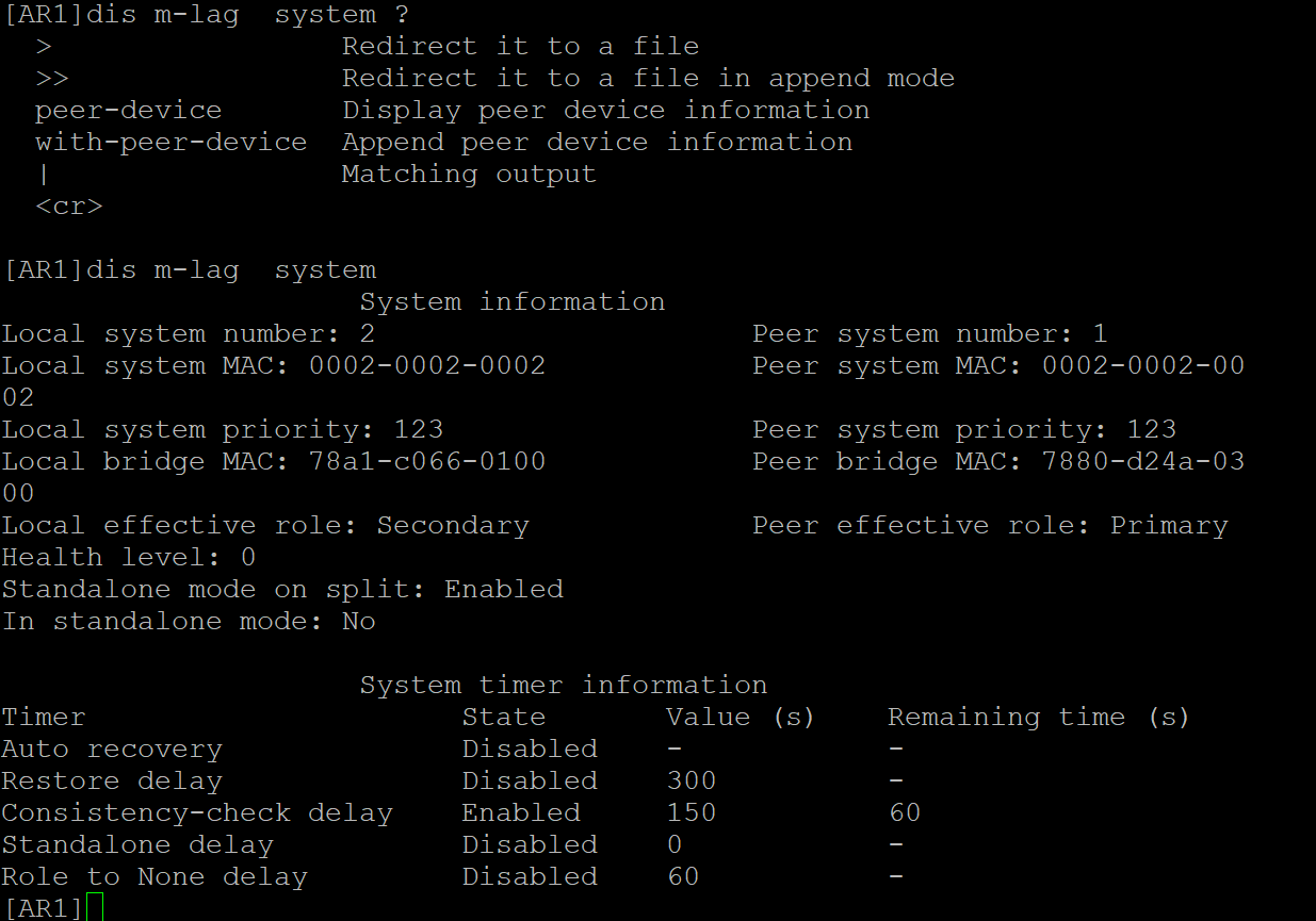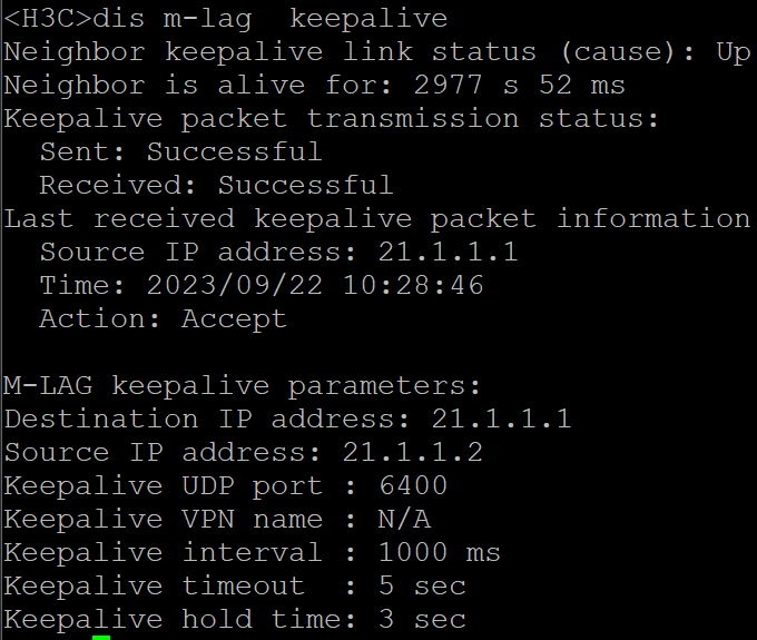 peer-link 链路:Bridge-Aggregation34 : 聚合了 1/0/3 和 1/0/4,状态正常。