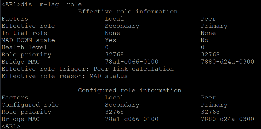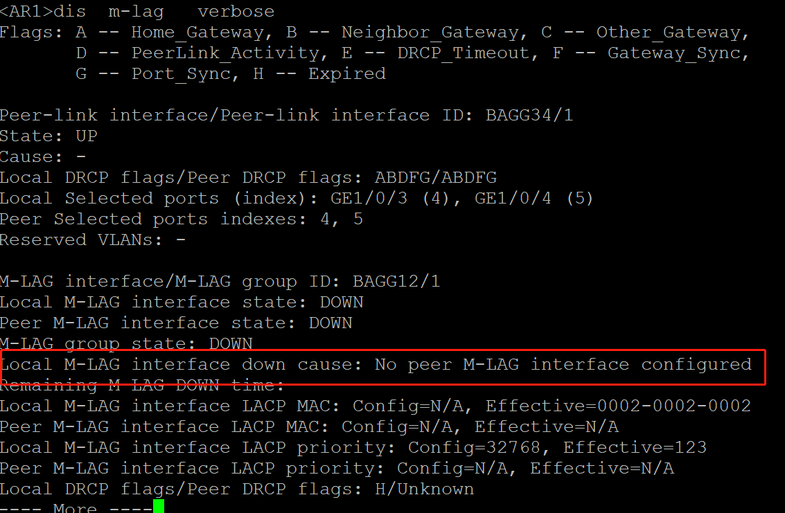 显示 Local M-LAG interface down cause: No peer M-LAG interface configured,