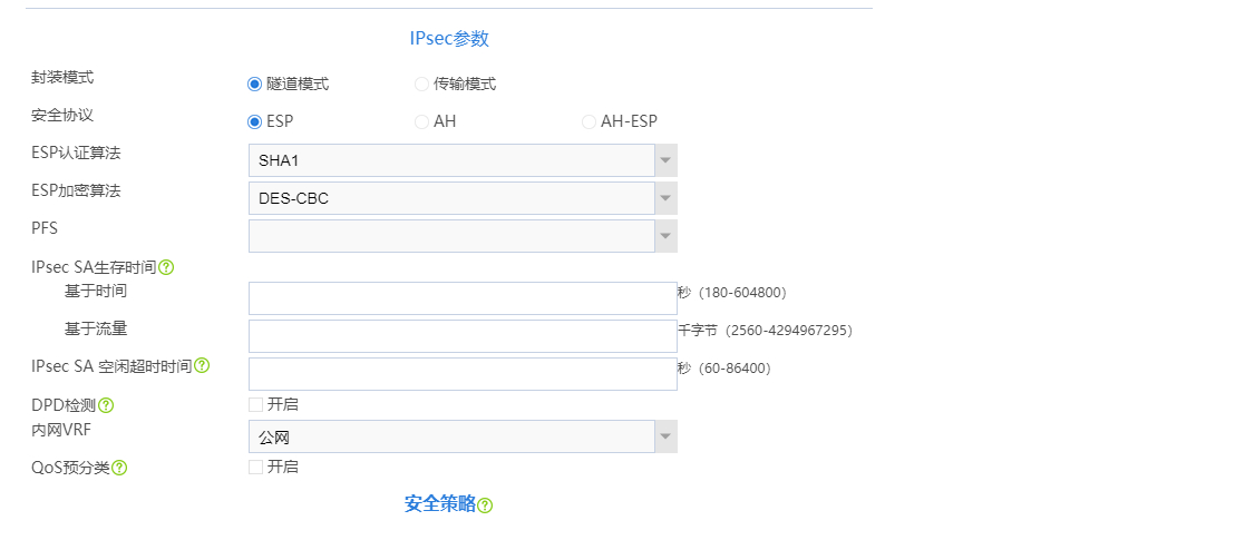 4、检查ipsec proposal(v5平台) /ipsec transform-set(v7平台)参数两端是否一致(封装模式、安全协议、验证算法、加密算法)