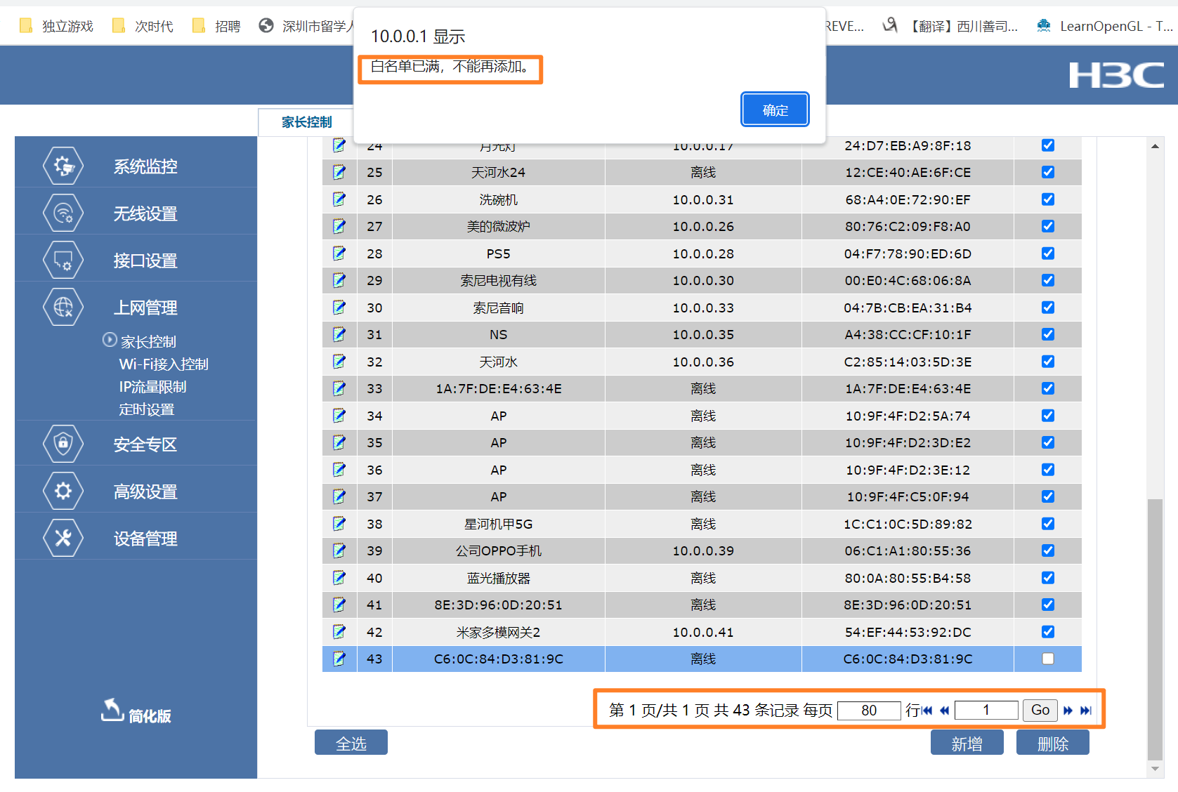 NX15000路由器,只能接入42个设备,再加入会显示白名单已满。
