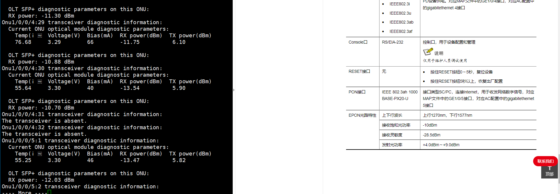 上右图是官网查到的光功参考值,上左图是OLT上查到的ONU口光功,请问WA6320H-XEPON的光口光功值 应该在哪个范围?