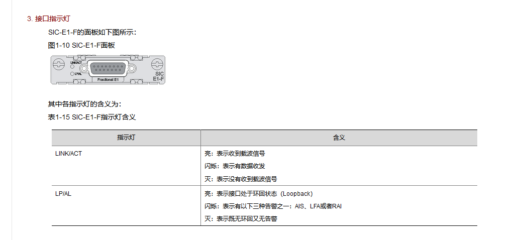 SIC-E1-F是1端口非通道化E1模块的简称,其中F表示“部分(Fractional)E1” https://www.h3c.com/cn/d_201807/1095361_30005_0.htm。该模块上有四个指示灯,分别是: