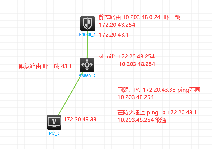 问题: pc 172.20.43.33  (网关在防火墙上) 无法ping通 核心上的 10.203.48.254