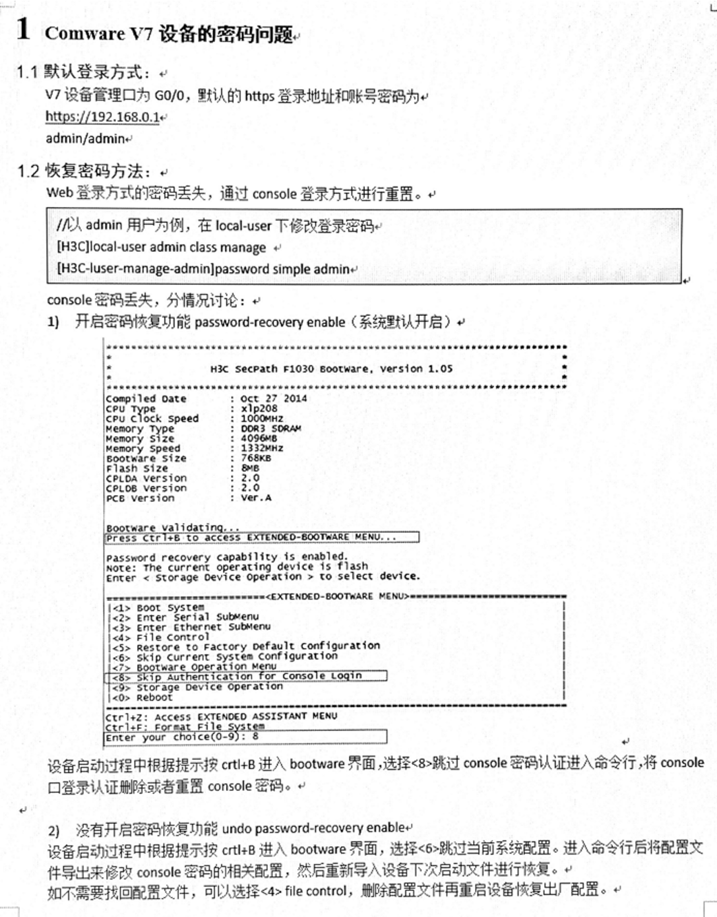 如果使能了密码恢复功能,当用户忘记了Console口密码时,可以重启设备根据系统提示按Ctrl+B进入BootWare主菜单选择<6>,即以忽略系统配置的方式启动,此时设备不会删除原有的配置文件。