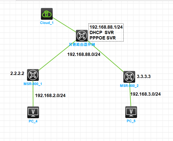 外网路由器已经做好策略,192.168.88.0/24都能上网的。2个MSR800是自动获取IP(88.X)带两网段的。