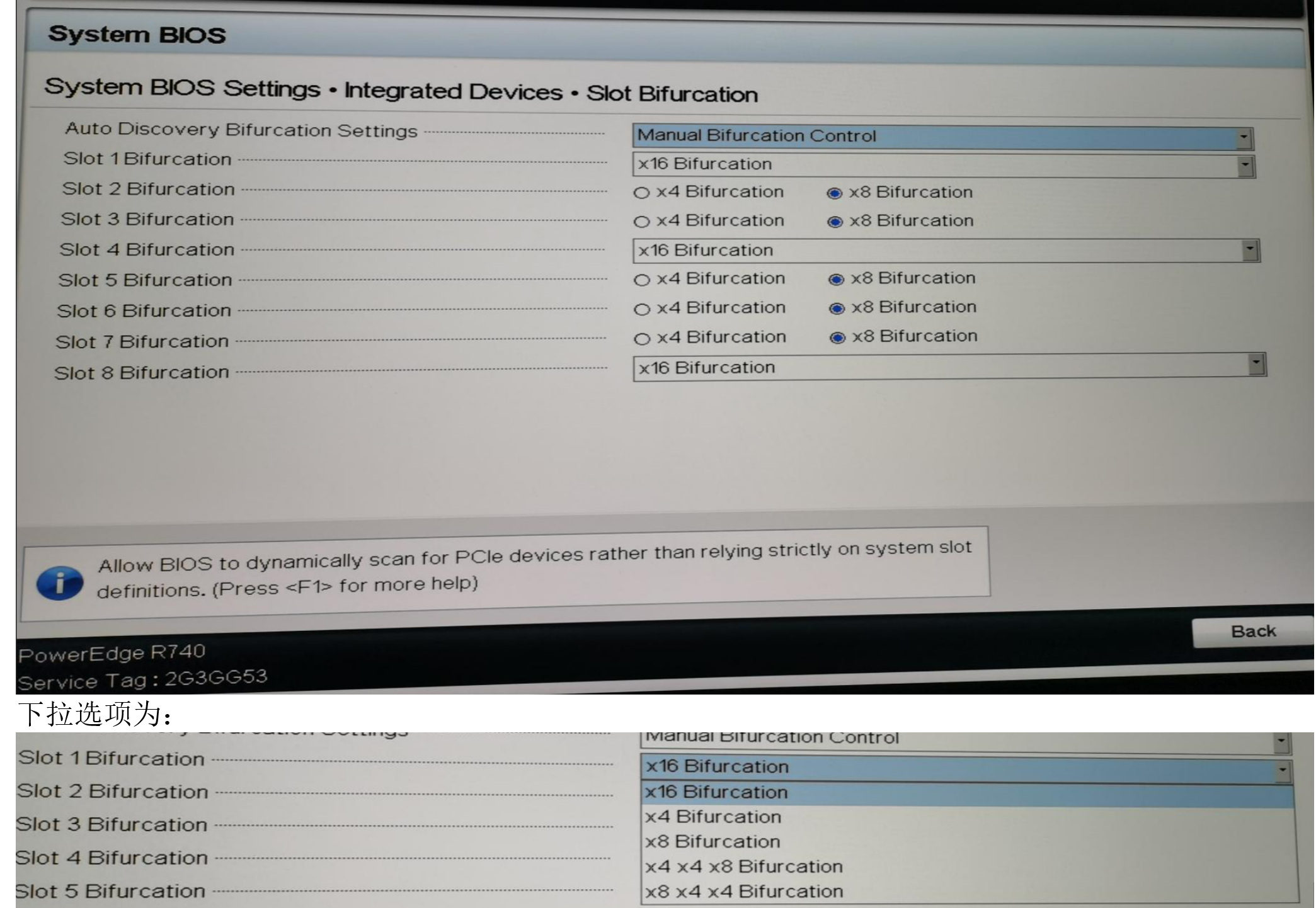 请问一下,华三服务器主板上的x16的PCIe插槽支持拆分为X8X8吗?即PCIE BIFURCATION功能支持情况,友商服务器是通过BIOS中配置的,如图;