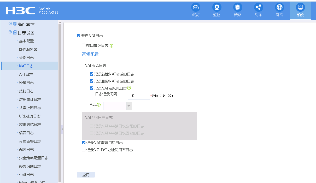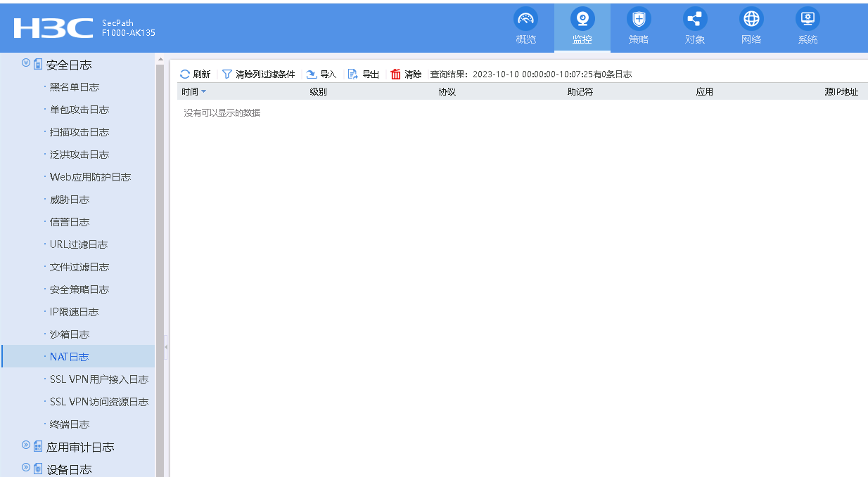 F1000-AK135的防火墙已经开启了NAT日志,但是在“安全日志”里面看不到任何的日志信息?