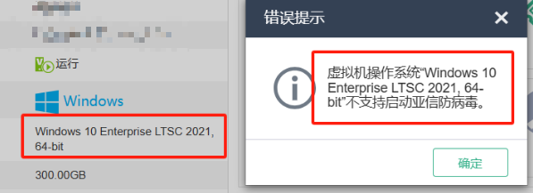 UIS超融合在win10 ltsc 2021版本开启亚信防病毒失败,报错如下图所示,但看兼容性列表并未写该兼容性问题,该如何处理?