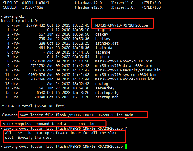 执行 boot-loader file flash:/MSR36-CMW710-R6728P26.ipe main
