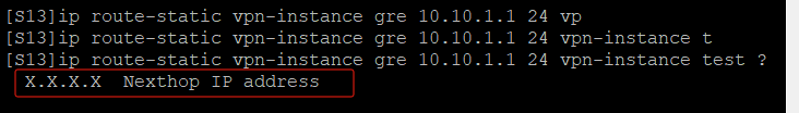 (2)模拟器测试交换机vpn-instance gre 和 vpn-instance test 某些地址互通,如下图,为什么目的vpn-instance还需要写下一跳,下一跳是什么?
