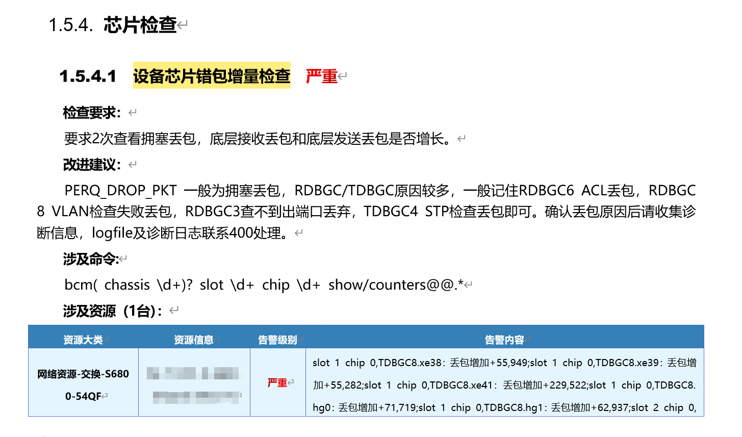用标杆巡检出一个问题项“设备芯片错包增量检查”,通过给的命令bcm( chassis \d+)? slot \d+ chip \d+ show/counters@@.*