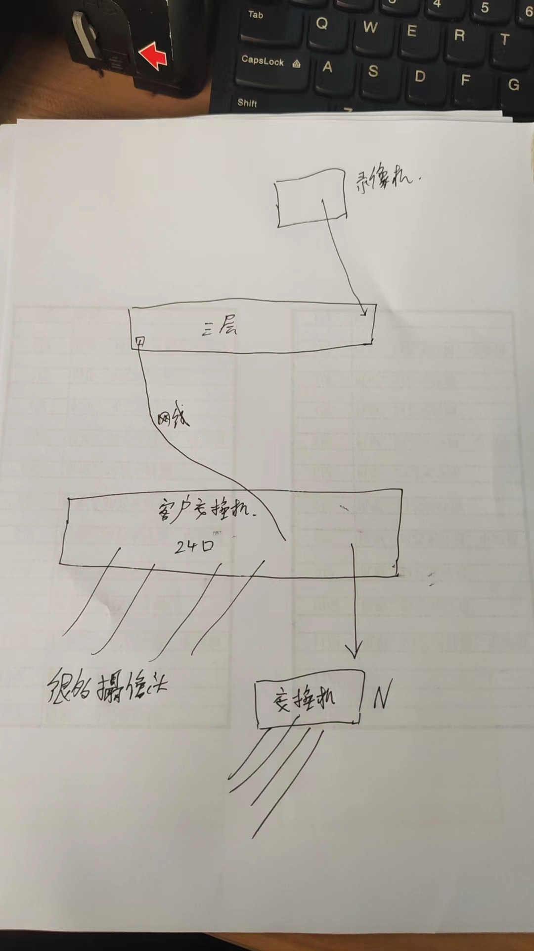 客户交换机是傻瓜交换机接在三层交换机上。三层交换机接录像机。监控接在客户交换机上。有三个段31,32,30要互通。30,31是监控。32是录像机。监控接在傻瓜交换机上,录像机接在三层交换机上。