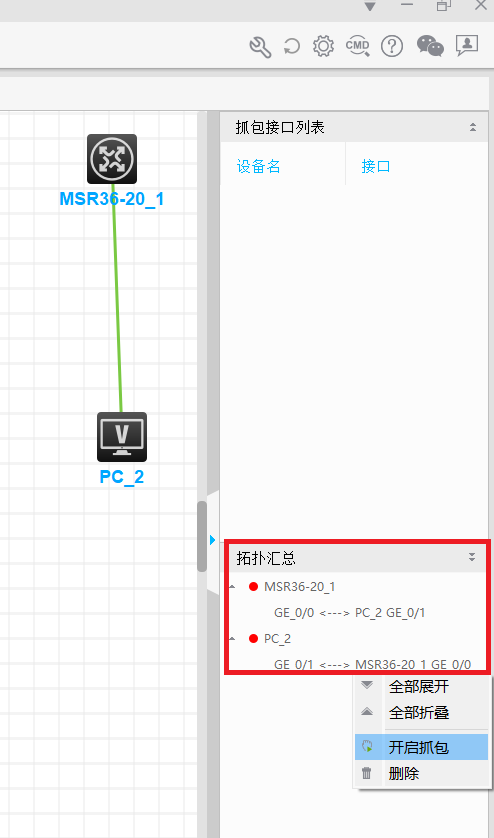如果你右键没反应,可以把线缆拉长方便对准;或者改用右下角的拓扑汇总抓包。