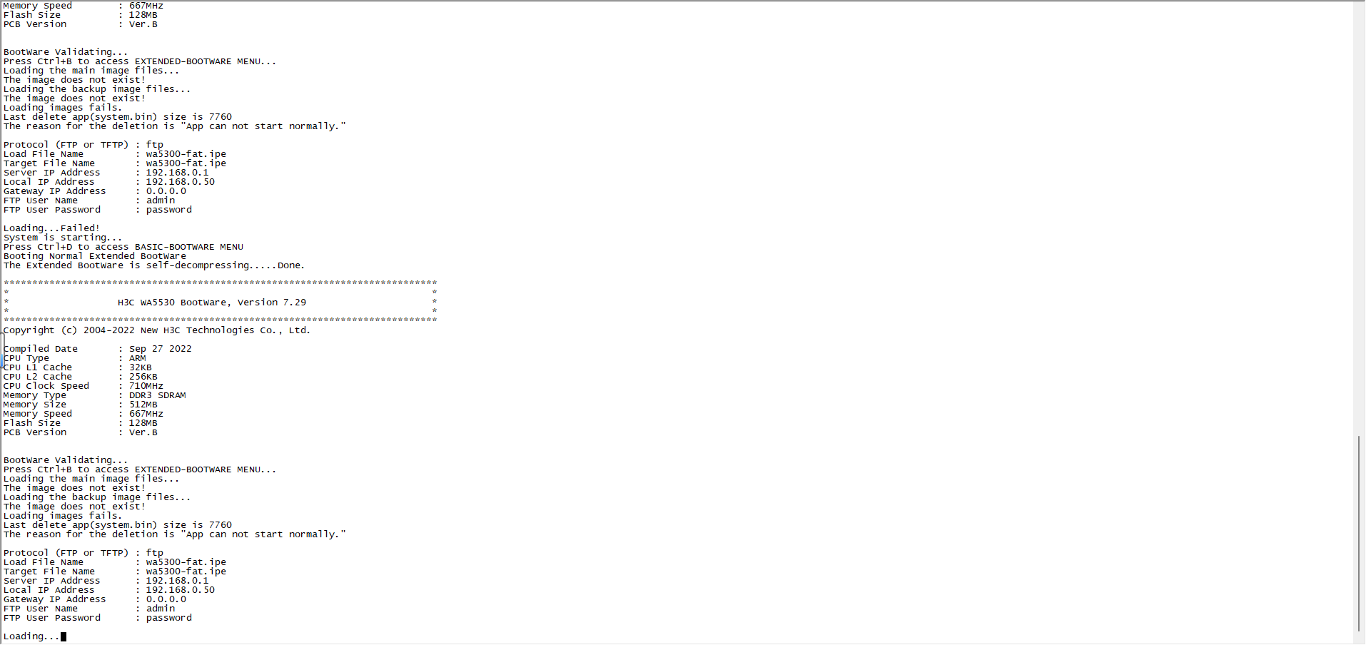 BootWare Validating... Press Ctrl+B to access EXTENDED-BOOTWARE MENU... Loading the main image files... Loading file flash:/wa5300-fat-system.bin................................... ....Done. Loading file flash:/wa5300-fat-boot.bin..........Done. Image file flash:/wa5300-fat-boot.bin is self-decompressing................. ..........................................Done. System image is starting...又重启 System is starting... Press Ctrl+D to access BASIC-BOOTWARE MENU Booting Normal Extended BootWare The Extended BootWare is self-decompressing.....Done. **************************************************************************** * * * H3C WA5530 BootWare, Version 7.29 * * * **************************************************************************** Copyright (c) 2004-2022 New H3C Technologies Co., Ltd. Compiled Date : Sep 27 2022 CPU Type : ARM CPU L1 Cache : 32KB CPU L2 Cache : 256KB CPU Clock Speed : 710MHz Memory Type : DDR3 SDRAM Memory Size : 512MB Memory Speed : 667MHz Flash Size : 128MB PCB Version : Ver.B BootWare Validating... Press Ctrl+B to access EXTENDED-BOOTWARE MENU... Loading the main image files... Loading file flash:/wa5300-fat-system.bin................................... ....Done. Loading file flash:/wa5300-fat-boot.bin..........Done. Image file flash:/wa5300-fat-boot.bin is self-decompressing................. ..........................................Done. System image is starting... 又重启 System is starting... Press Ctrl+D to access BASIC-BOOTWARE MENU Booting Normal Extended BootWare The Extended BootWare is self-decompressing.....Done. **************************************************************************** * * * H3C WA5530 BootWare, Version 7.29 * * * **************************************************************************** Copyright (c) 2004-2022 New H3C Technologies Co., Ltd. Compiled Date : Sep 27 2022 CPU Type : ARM CPU L1 Cache : 32KB CPU L2 Cache : 256KB CPU Clock Speed : 710MHz Memory Type : DDR3 SDRAM Memory Size : 512MB Memory Speed : 667MHz Flash Size : 128MB PCB Version : Ver.B BootWare Validating... Press Ctrl+B to access EXTENDED-BOOTWARE MENU... Loading the main image files... Loading file flash:/wa5300-fat-system.bin................................... ....Done. Loading file flash:/wa5300-fat-boot.bin..........Done. Image file flash:/wa5300-fat-boot.bin is self-decompressing................. ..........................................Done. System image is starting...又重启