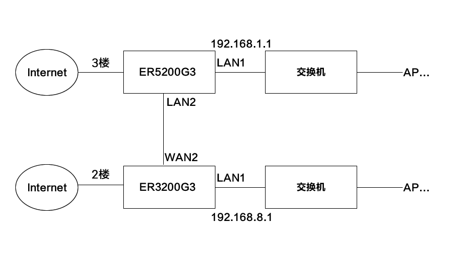 如下图所示,现有两层楼,3楼用ER5200G3路由器,下连AP若干