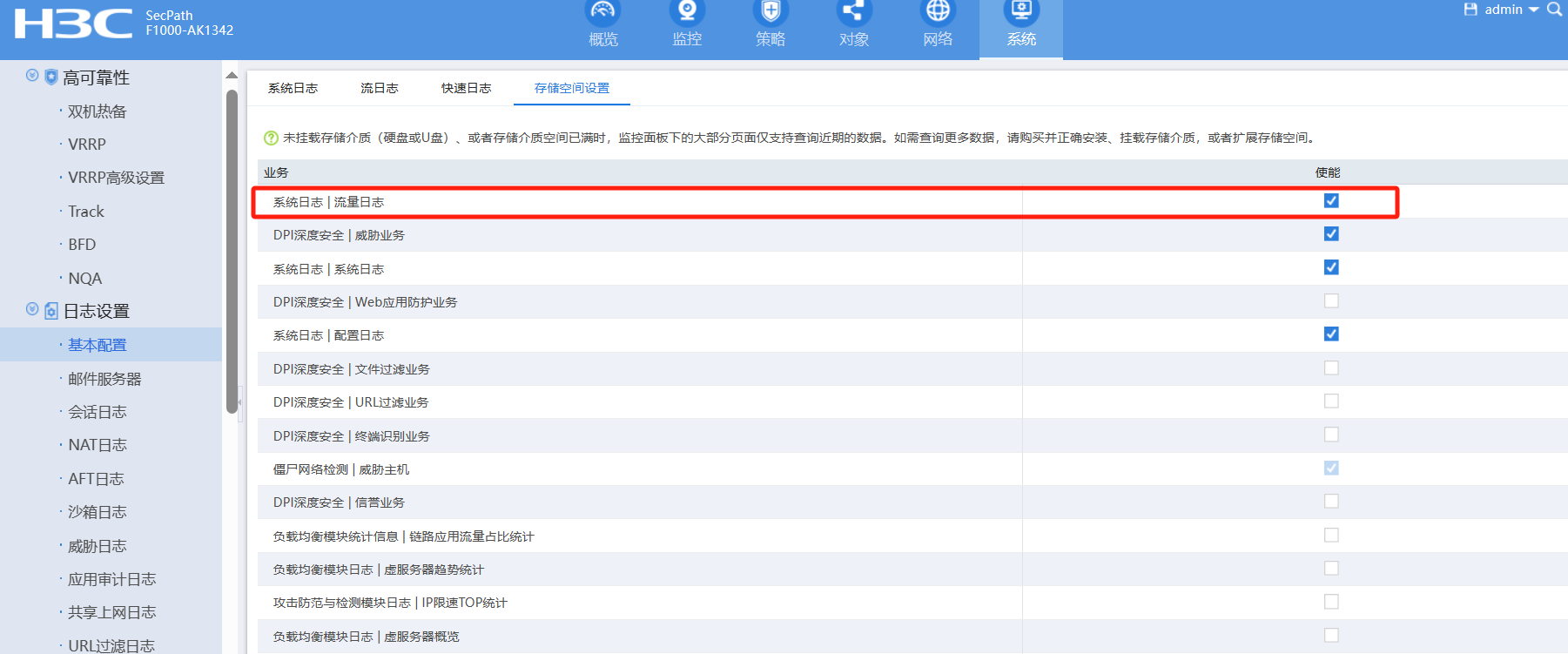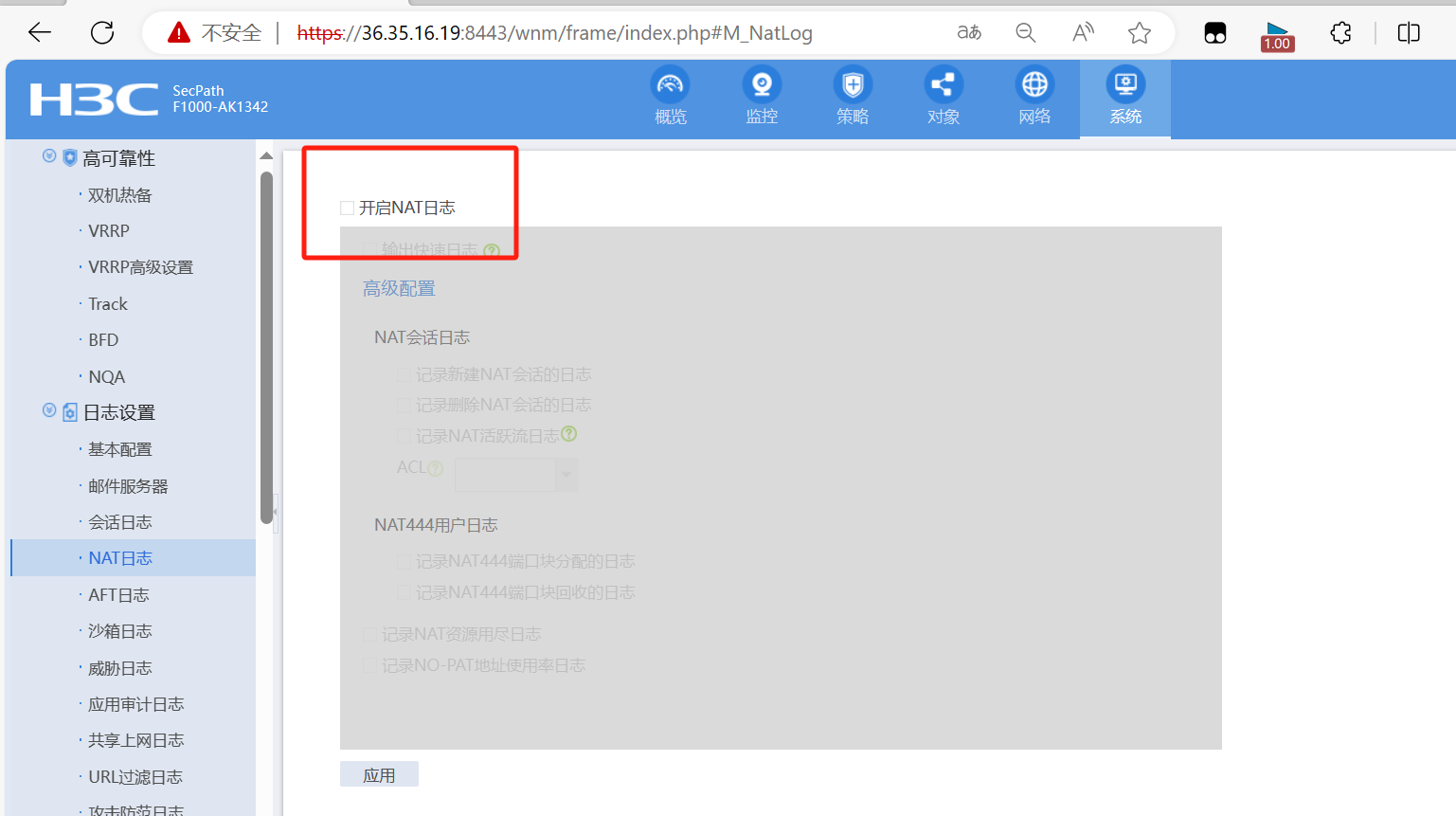 华三防火墙NAT日志WEB页面上无法显示,在系统日志哪里已经开启应用