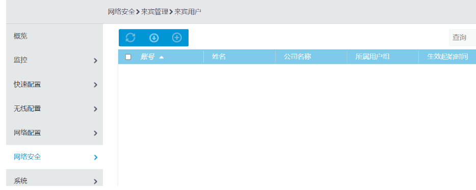单击页面左侧导航栏的“ 网络安全 > 来宾管理 > 来宾用户”,进入“来宾用户”页面,配置步骤为: