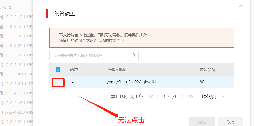 cloudosos5.0 纳管uis上的虚拟机,虚拟机的硬盘不能被选择。在云硬盘和云主机规格已经创建了纳管虚拟机的规格