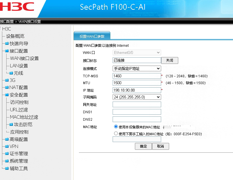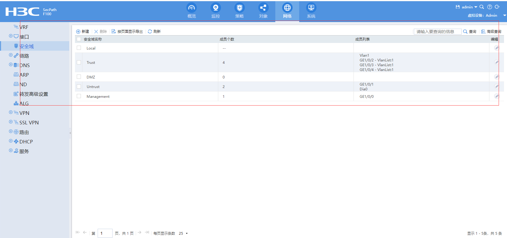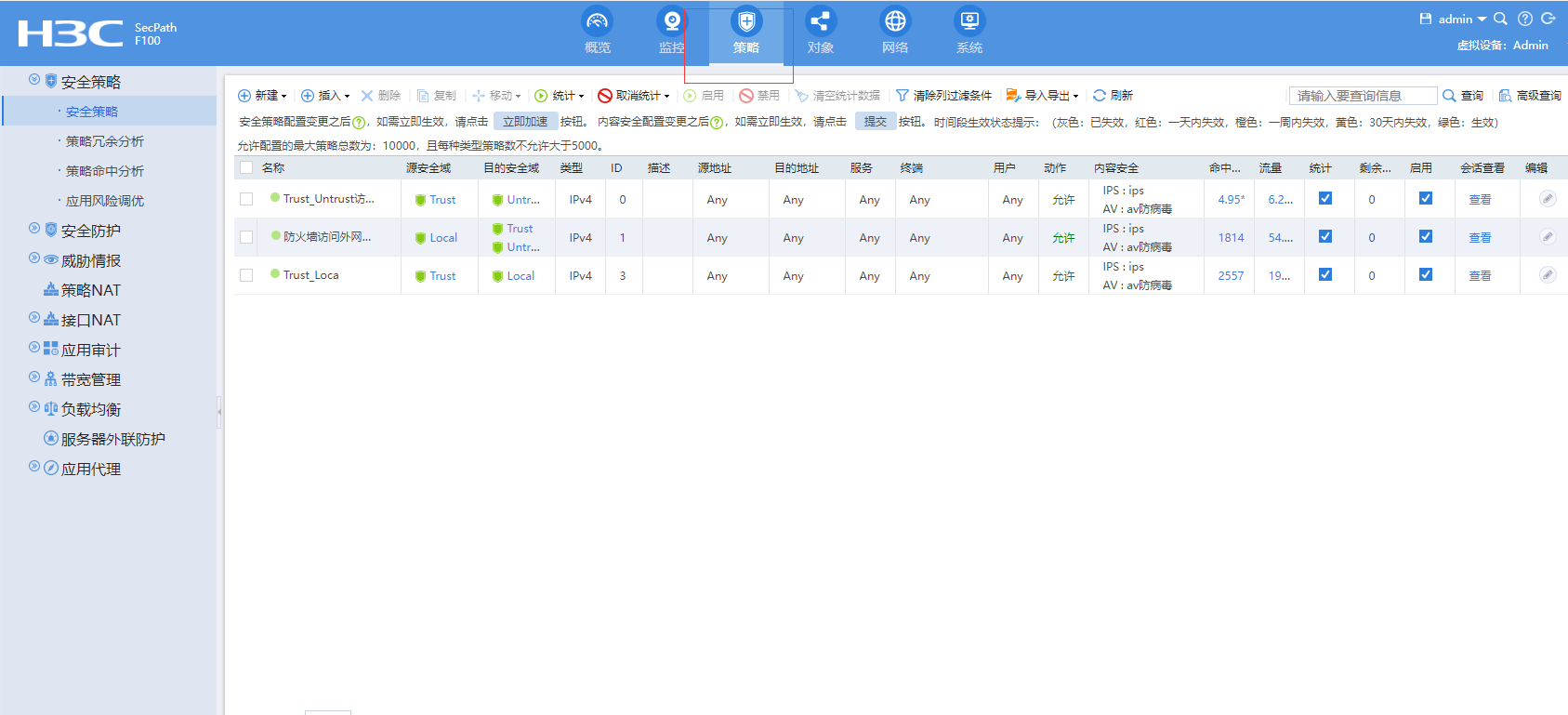 F100是新华三的防火墙,默认是没有安全策略,默认就是deny,你是怎么上到网的呢?web页面里面有一个”网络“在网络下面可以将接口加入相应的安全域 。