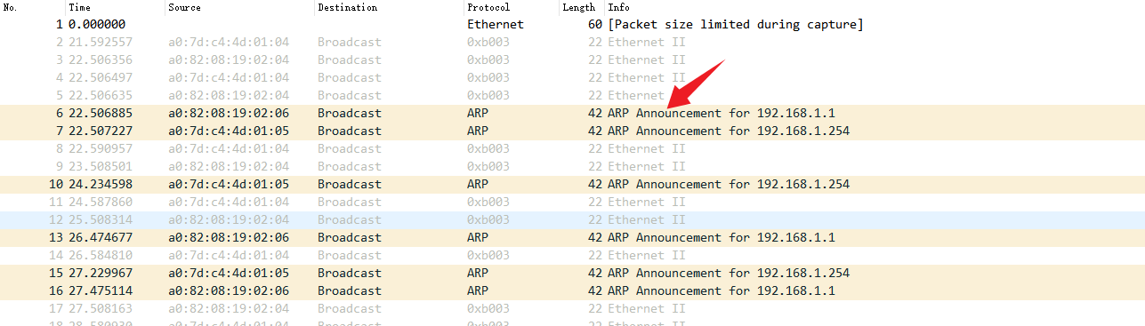 我启动设备没做任何操作,抓包发现有ARP的包,抓包发现info显示:ARP Announcement