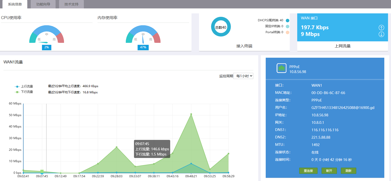 公司早上一上班那会,都会有持续10多分钟的卡顿,甚至直接打不开网页,路由器拨号上网的,是什么原因造成,是不是路由器性能不行。后台显示终端接入数量是40台设备,联通千兆。