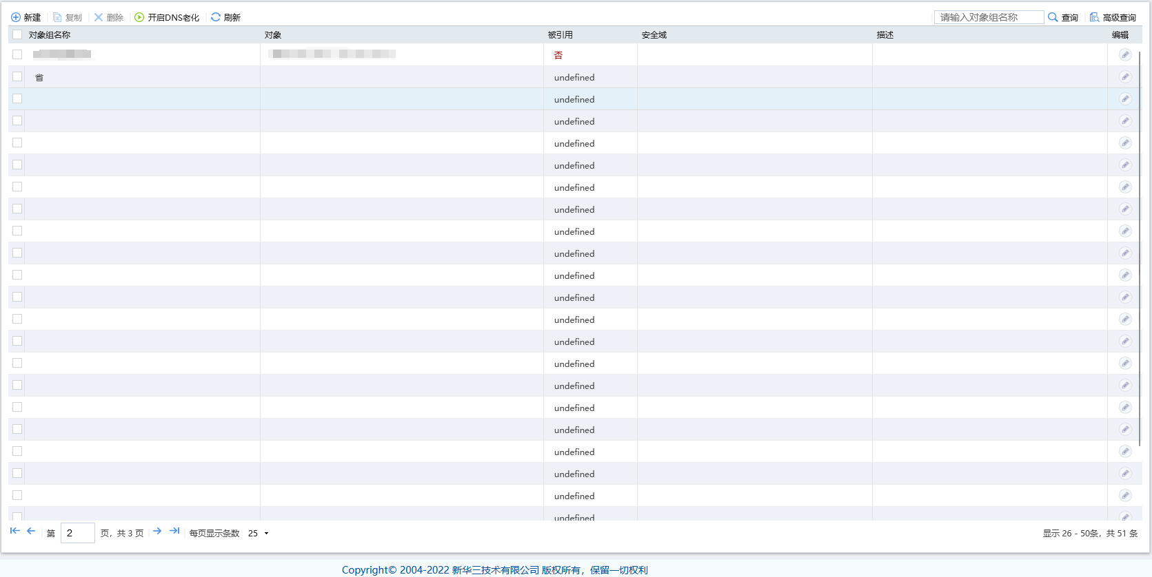 防火墙web页面一些对象组显示正常;一些对象组不显示,并且【被引用】一列显示undefined,也无法删除。命令行对象组显示正常。现在新添加对象组只能在命令行添加