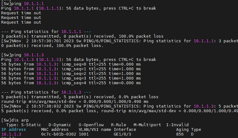 有时能学到10.1.1.1 的MAC地址,有时又没有: