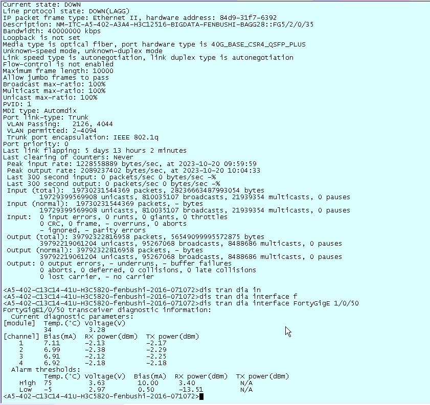 S12516F-AF设备与S5820接口二层静态聚合互联,聚合组中一对互连线如下图状态,收发光正常,接口down。怀疑是协议down。这种问题应该怎样排查及判断?