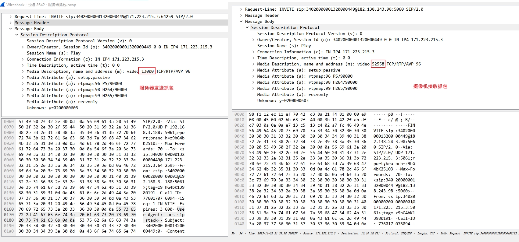 服务器发送的数据包,端口为13000,到外网后,摄像头收到的端口已经变成了随机端口52558了