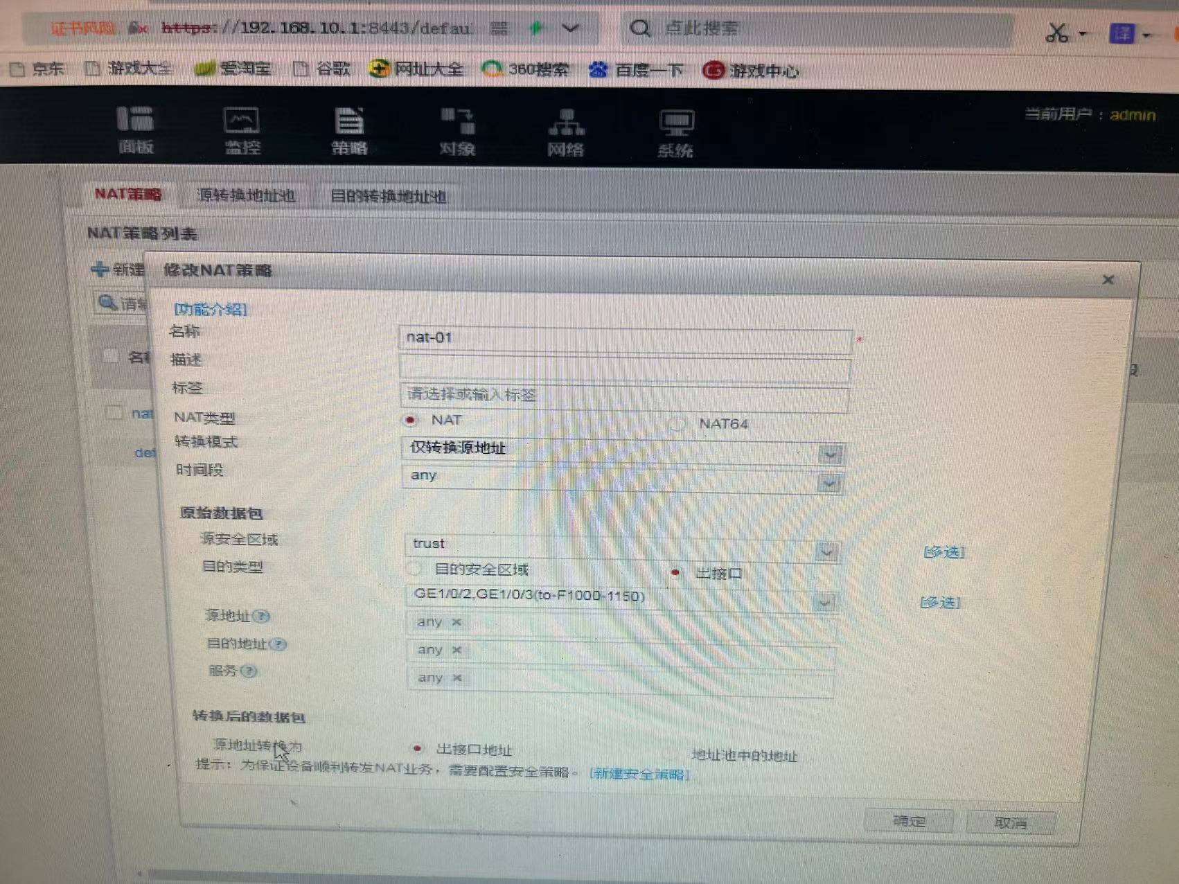 防火策略都是全放通的,华为的nat也已经把接口添加了