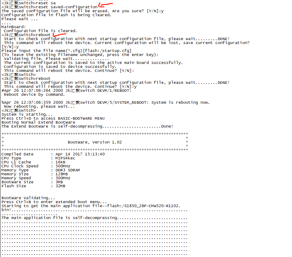 reset删除配置之后,reboot这条命令敲完,第一个要选择N,第二个选择Y,这样才可以的