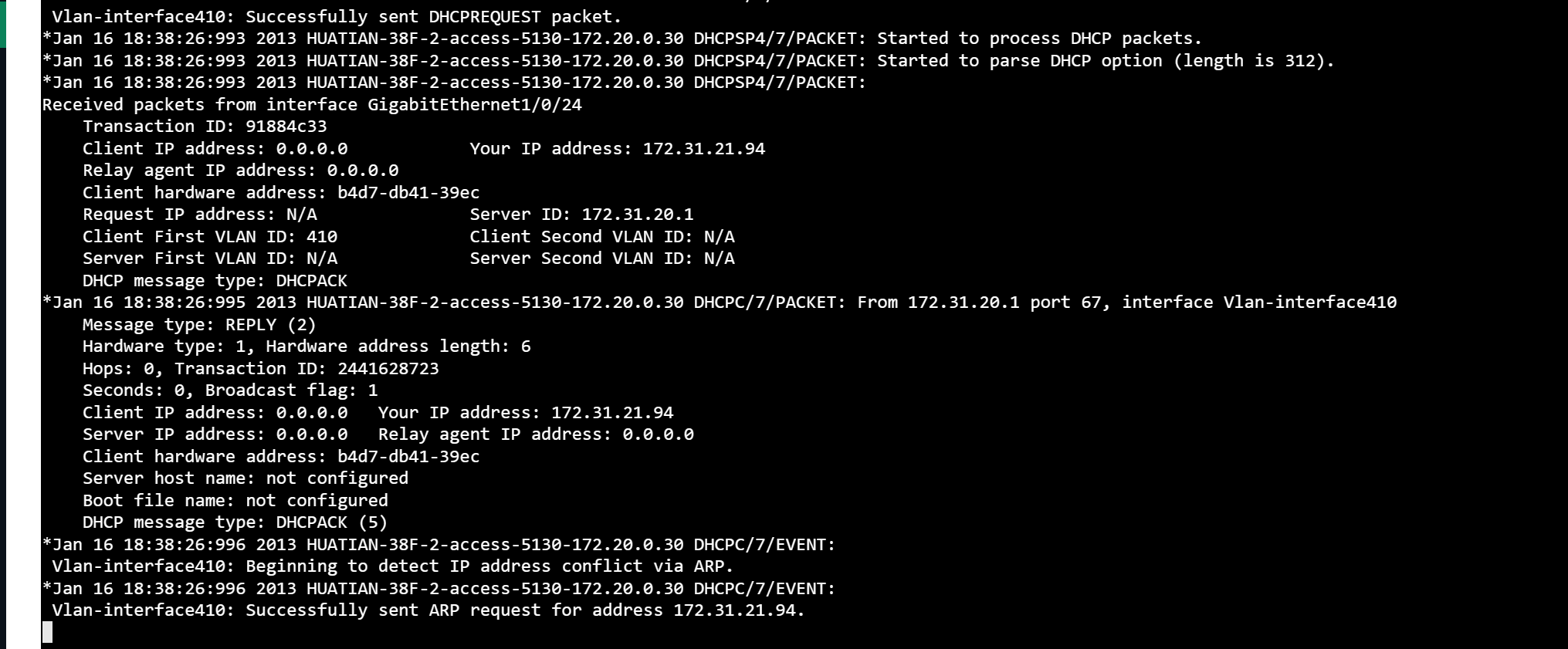 每当无线业务用户数达到500左右时,就会出现无线用户无法获取地址,网关厂家查询地址池ip数量还有五百个未分配,在接入交换机上debug查看interfacevlan200接口dhcp信息,只有DHCP Discovery信息