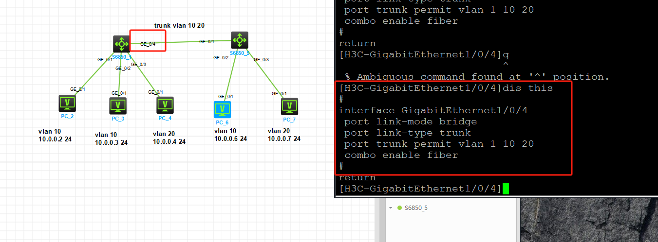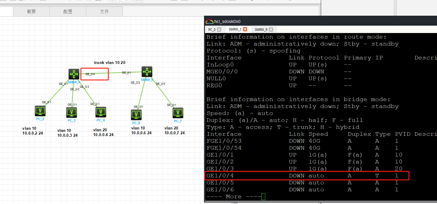 做vlan实验,vlan配置如图,在配置了两台交换机的trunk口,pc2能ping通pc3,但是不能ping通pc6,查看接口发现,两台交换机的trunk口是有一个是down的状态,请问大家是什么情况?