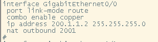 ]dis nat outbound NAT outbound information: Totally 1 NAT outbound rules. Interface: GigabitEthernet0/0 ACL: 2001 Address group ID: --- Port-preserved: N NO-PAT: N Reversible: N NAT counting: 0 Config status: Active