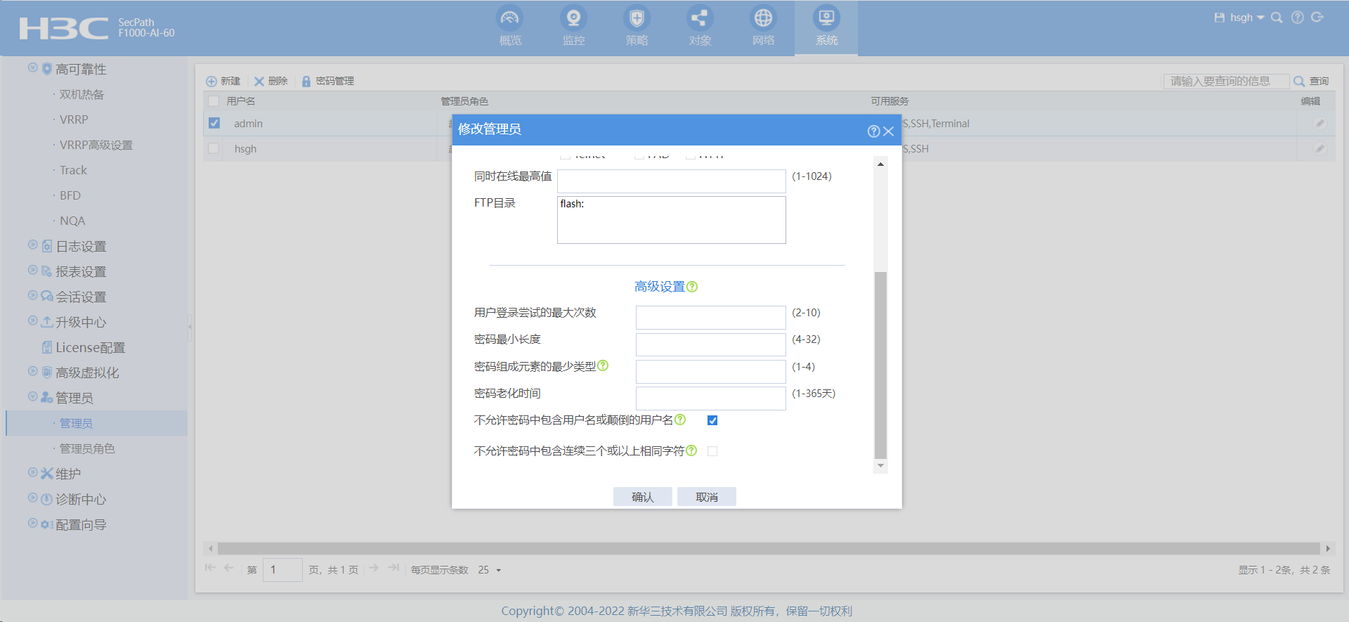 H3C SePath F100-E-G防火墙是否支持密码复杂度配置?在web配置页未找到