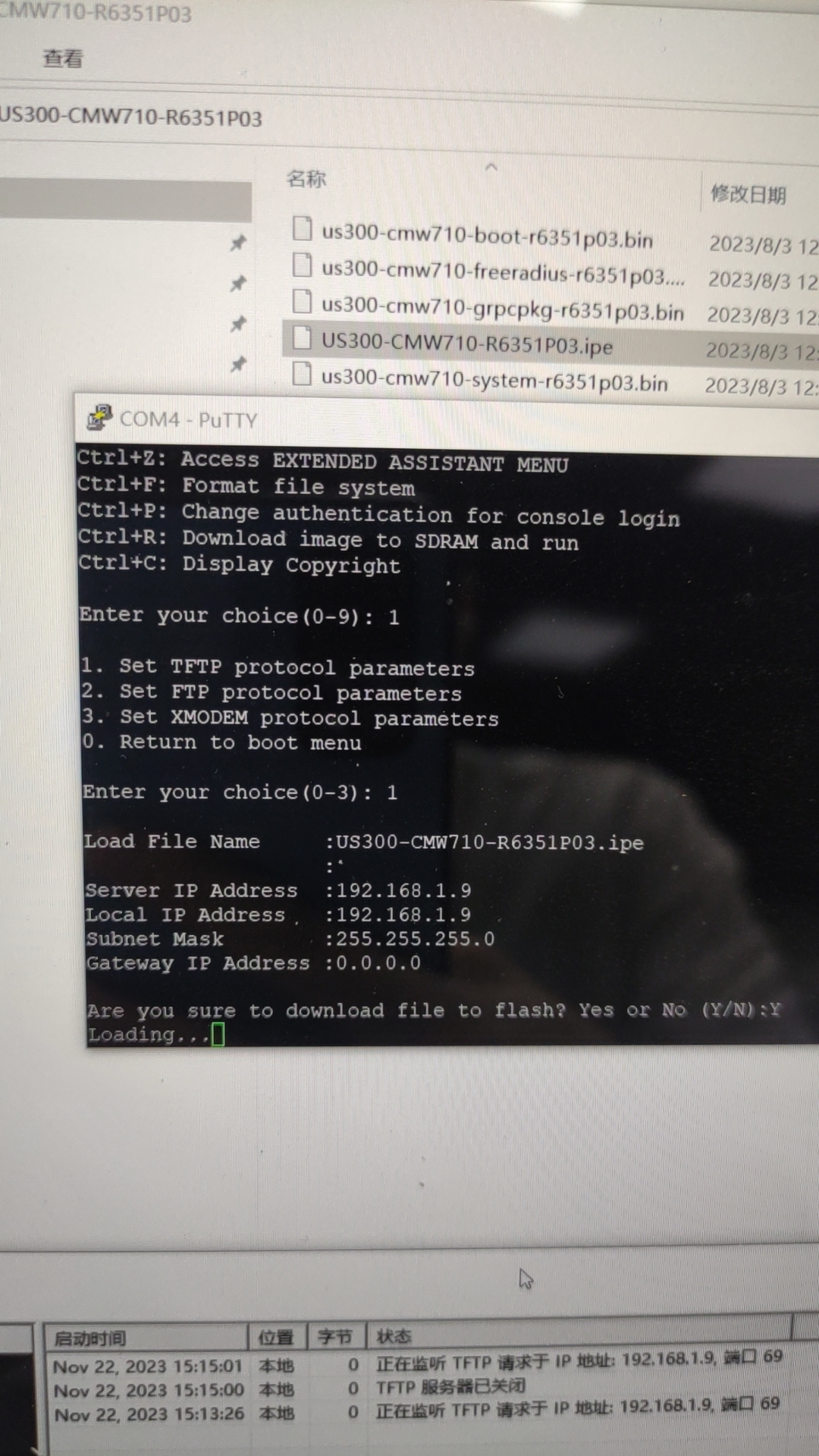 网线口配的ip192.168.1.9,console进去选中tftp传输