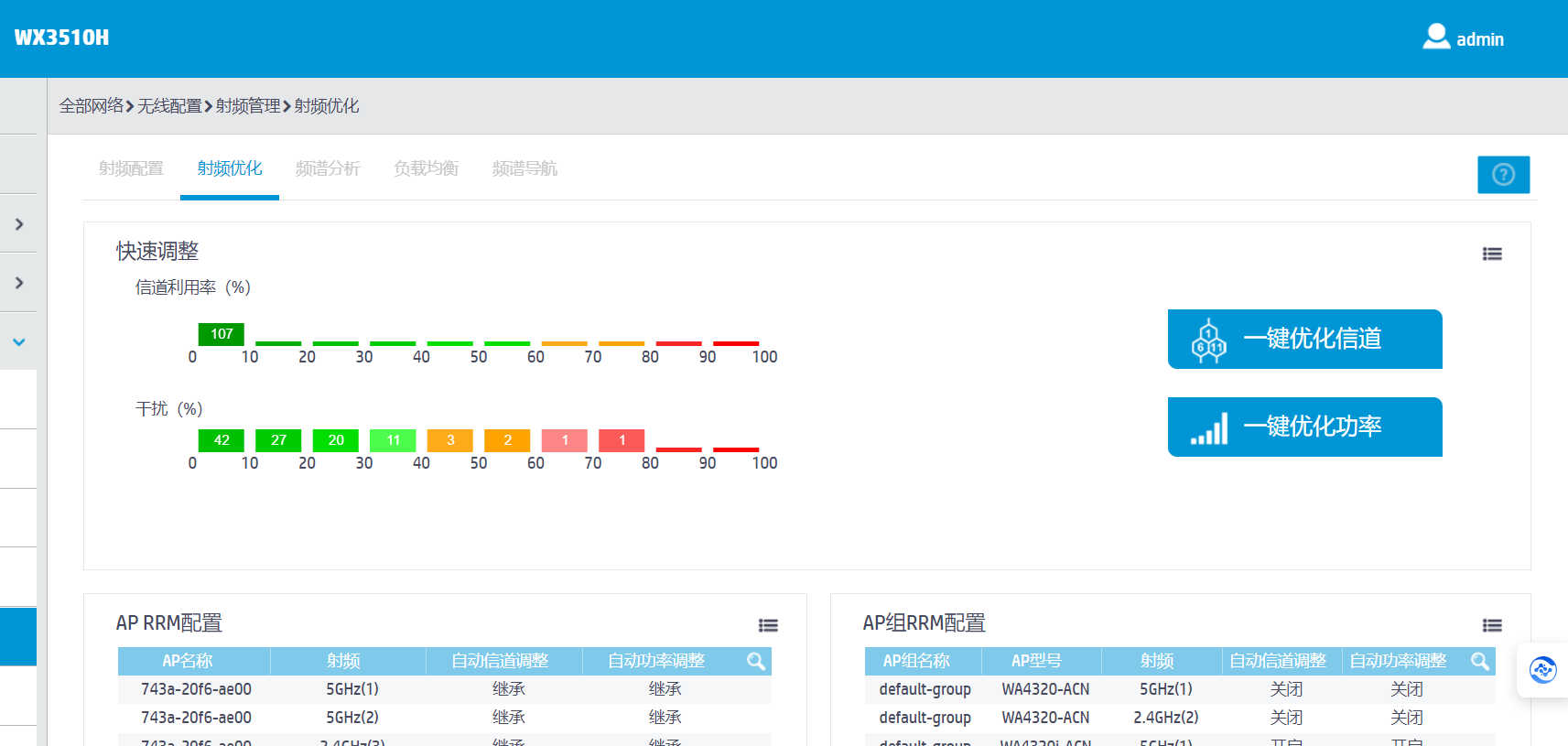 信道配置:80%AP关闭了2.4G,带宽统一设置为20M,功率8