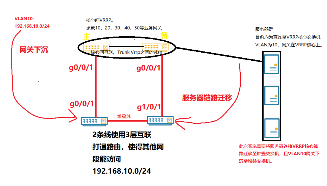 目前有一堆新加入的堆叠交换机,需要与VRRP核心之间3层互联,且打通路由。