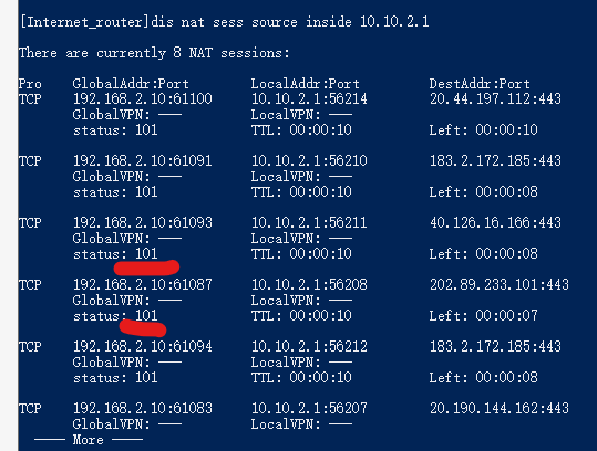 发现了如下图的情况,这个10.10.2.1这个IP就是当时出不去外网的计算机IP,它的nat表的status都是101。其他正常能上外网的ip,这个status是1。