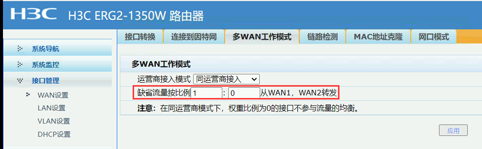 1:1是均衡流量,不是主备了,要求wan1正常的时候wan2不分流