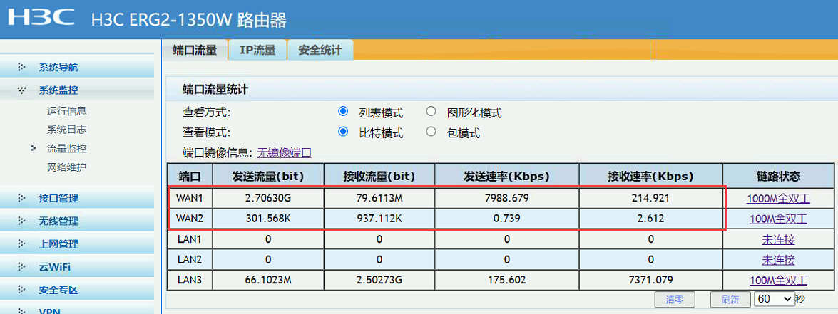 当wan1正常时wan1和wan2都有上下行流量(下图)