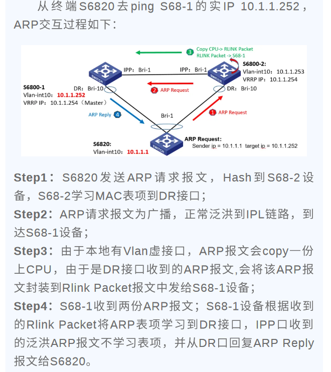S68-1收到两份ARP报文;S68-1设备根据收到的Rlink Packet将ARP表项学习到DR接口,IPP口收到的泛洪ARP报文不学习表项,并从DR口回复ARP Reply报文给S6820。回的IPP口收到的泛洪ARP请求