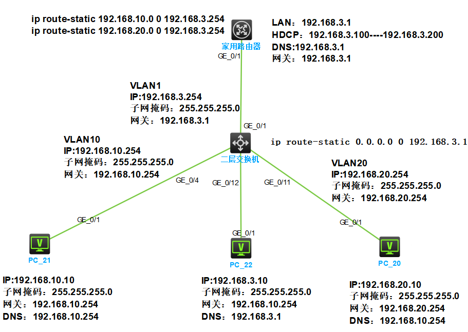 VLAN20为9至11口    12口接电脑22(IP:192.168.3.10   子网掩码:255.255.255.0    网关:192.168.10.254    DNS:192.168.3.1)