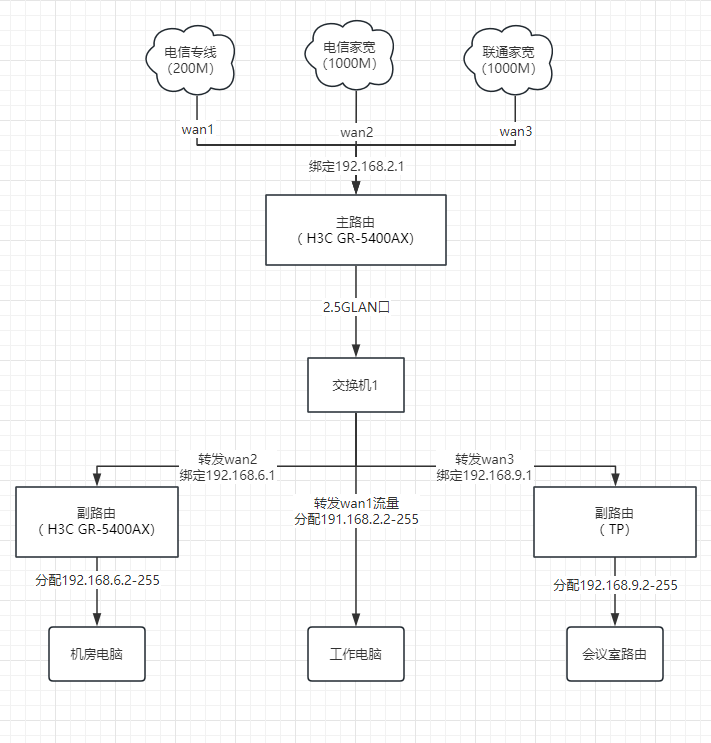 按业务来分,会议和老板和财务走专线,其余走电信和联通加宽就行了
