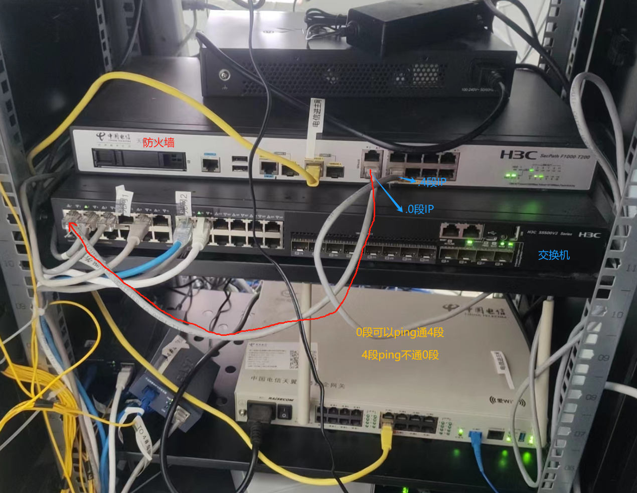 4段IP网线是直接插在防火墙口上B区域在上网使用,0段IP网线是从防火墙0段连接到交换机上A区域在上网使用。