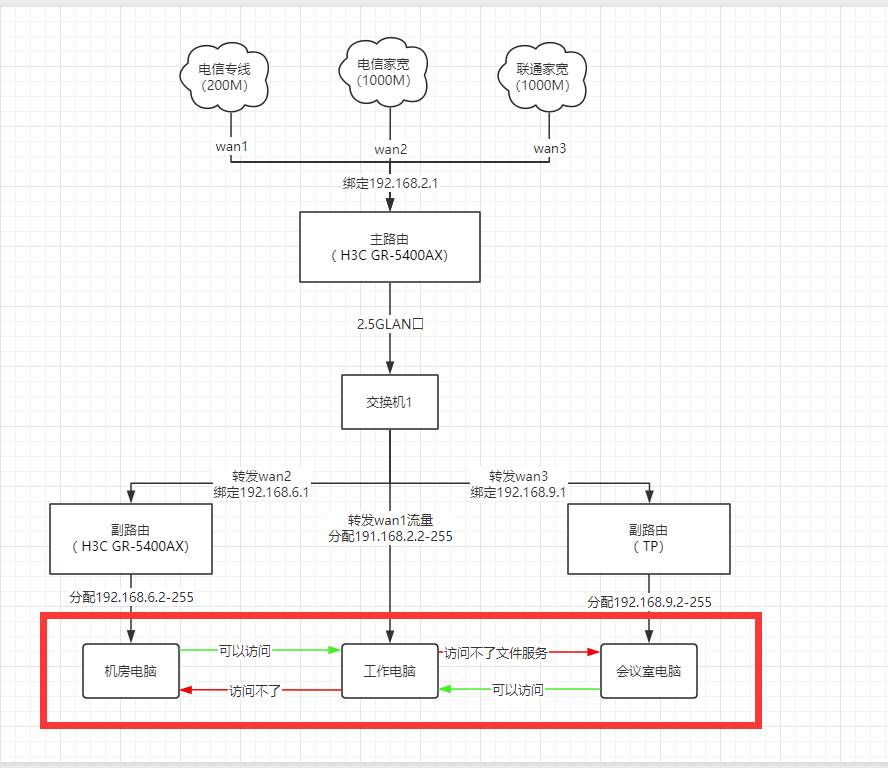 目前网络的架构是这个样子,旁路由能访问主路由下的设备,但是主路由不能访问旁路由,两个旁路由也无法互相访问,请问需要做什么才能让三个路由器下的设备互相访问