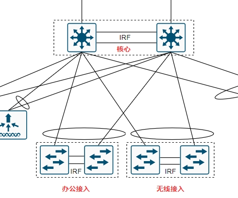 1. 两台核心层交换机通过IRF技术实现堆叠,形成一个逻辑交换机,称为核心堆叠组。