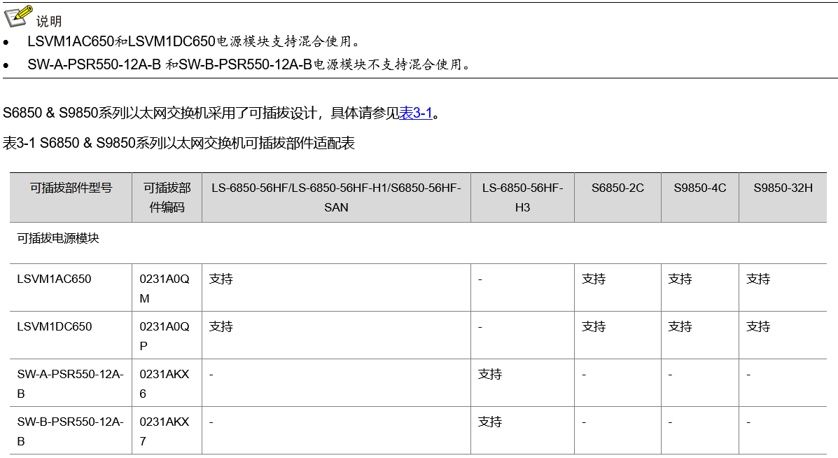 S6850 & S9850系列以太网交换机采用了可插拔电源模块。用户可根据实际需要选用相应的电源模块。